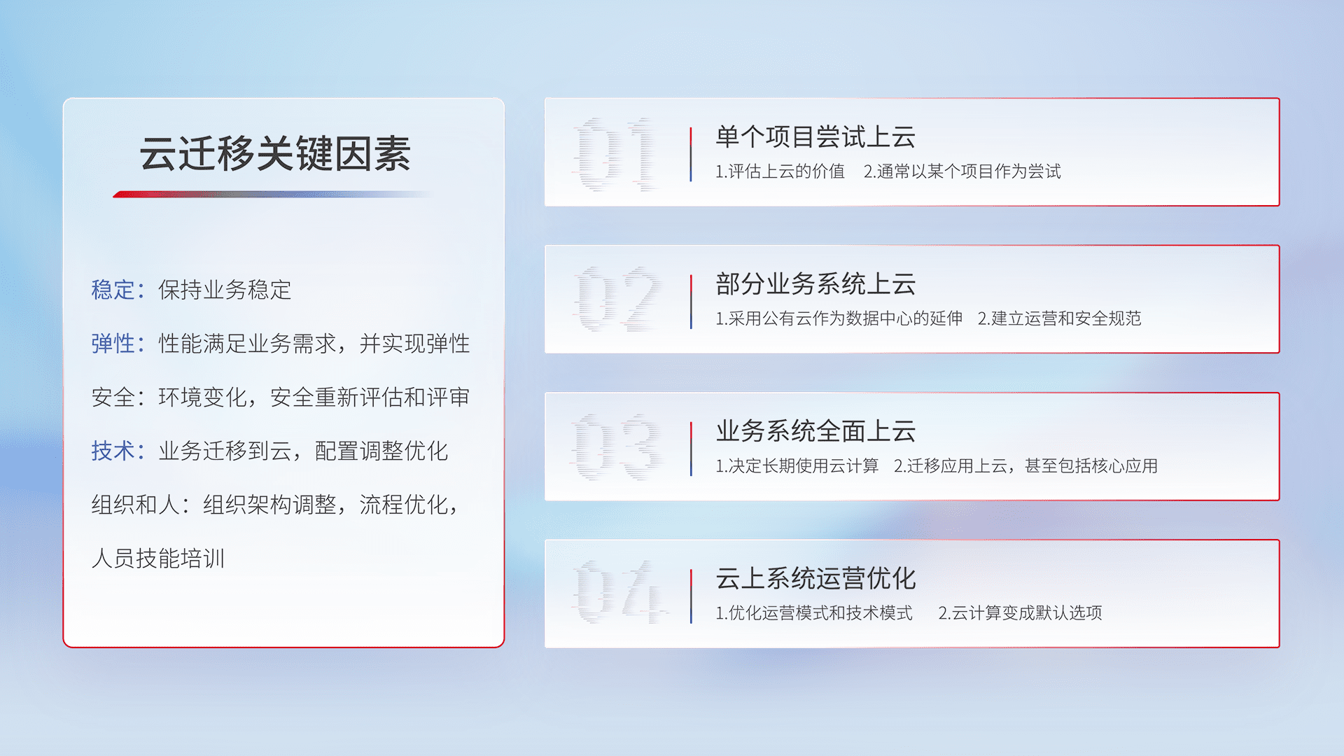 结合实际业务,,从规划设计、、云平台选型、、云原生改造、、数据迁移、、、、集成交付,,,,迁移全过程为客户识别最佳上云路径,,做好风险识别管理,,,,设计网络架构、、、、身份权限、、安全审计合规、、操作审计、、、、日志审计、、、、监控告警策略、、、多站点容灾设计等,,,对云上基础设施进行整体规划,,,提升IT治理水平,,以满足弹性、、高可用、、、高性能的需求。。。