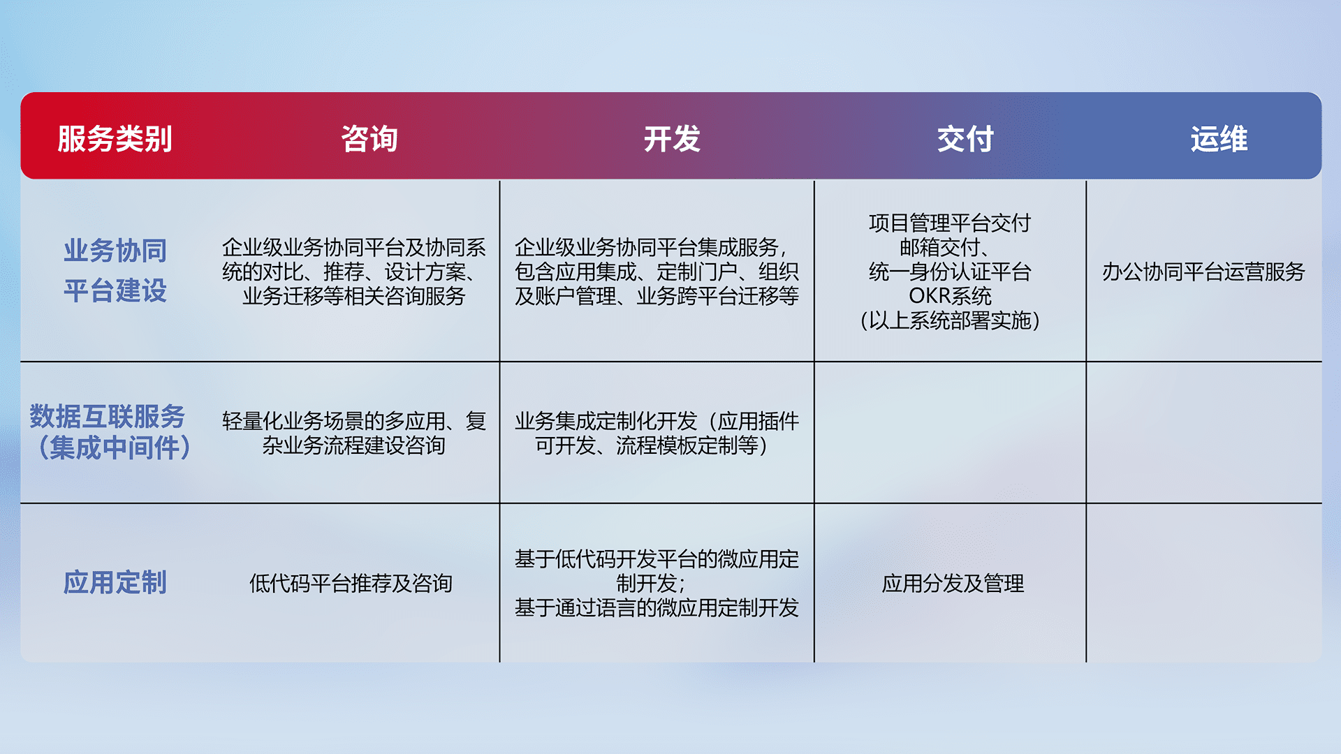针对钉钉、、、企微、、、、IDaas等平台级产品提供产品的规划、、、、方案、、交付、、定制化开发等服务,,,,实现如统一协同办公、、、、智能客户服务、、、、混合会议管理、、、智能数据查询、、、、等业务场景,,,,实现数字化转型。。。